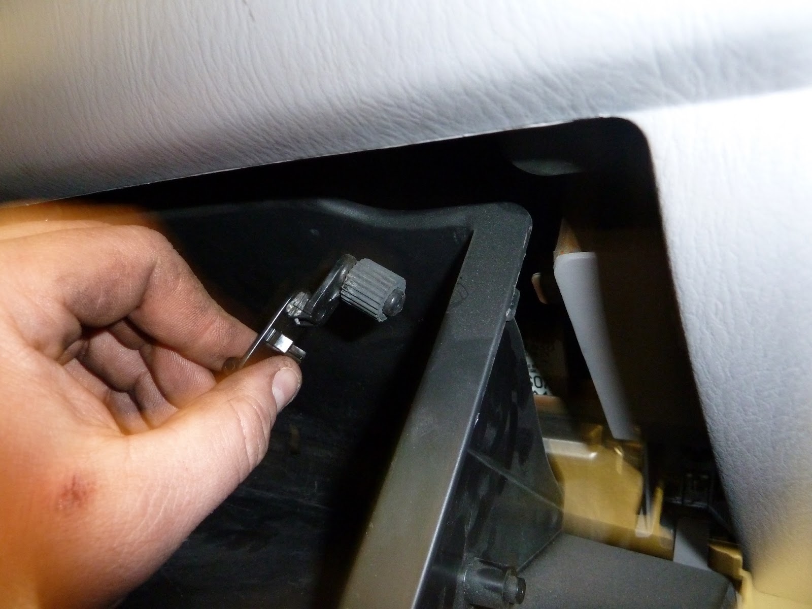 The first thing to do is remove the glove box. I will warn you right now, if you are doing this on a car that is not yours tell the owner you need to remove their stuff from the glove box. That will give them fair warning to remove stuff they might not want seen by someone. I have seen some interesting stuff in a glove box before. Back to the job, empty the glove box and you will see 2 rollers on the sides of the box.
